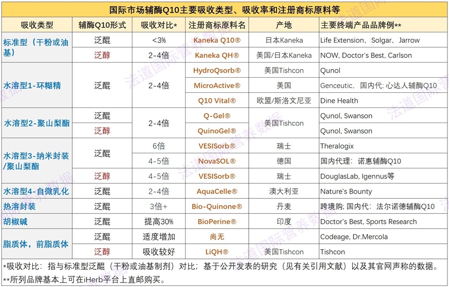 c. 注册商标原料,包括泛醌(Kaneka Q10®)、泛醇(Kaneka QH®)以及各种提高吸收的专利制剂。