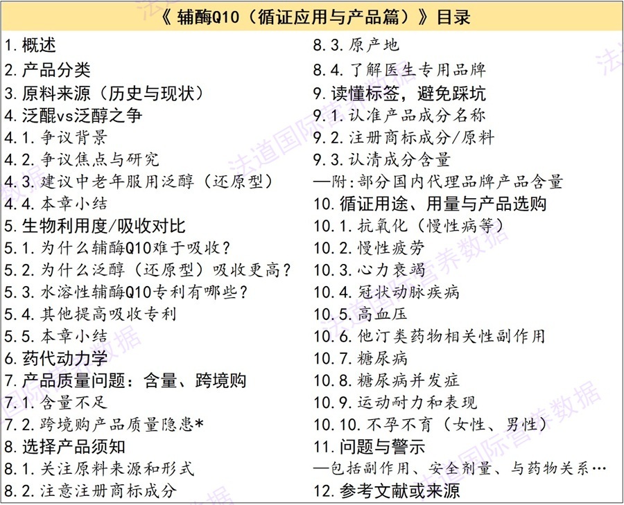 为满足广大用户的迫切需要,顺应发展趋势,本网站数据库将陆续推出重要营养素(如鱼油、辅酶Q10和益生菌…等)的有关产品信息,包括品牌、价格对比和购买链接,并基于有关大量临床研究数据,将作用评估分级,及汇集用量和使用周期等关键内容。信息力求深入、广泛和新颖,并附有文献或信息来源等佐证。继《鱼油既欧米伽3》后,本篇《辅酶Q10(循证应用与产品篇)》(以下简称《辅酶Q10》,目录见下图1)正式上线了!会员用户可点击进入全文阅读,非会员用户可点击摘编版《辅酶Q10用途、用量与产品精选》阅读和选购常用产品。